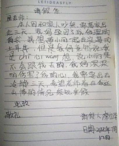 再看这张请假条,满满的一页纸,仔细看完发现这里面的内容貌似非常丰富,先是要离家出走,再要带小丽去浪漫的土耳其,这孩子应该很会唱那首《带你去旅行》,痴心妄想四个字有两个字不会写就凭这一点老师也不能准假,在学校好好