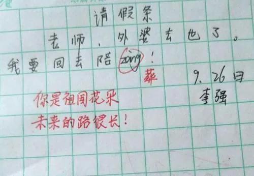 这张假条的内容是:“老师,外婆去世了,我要回去陪zng。”看来这位小朋友请假的原因是,亲人去世,要回去“送葬”。但是由于措辞不当,他居然说成了