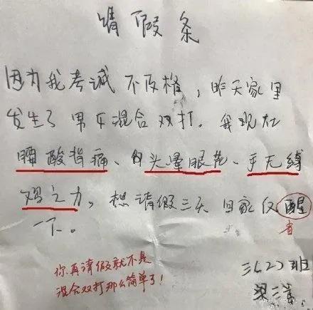 师看到这张请假条笑得眼泪都出来了,马上告诉这位同学,要是再请假的话就不是混合双打这么简单了。