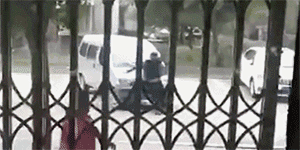 一丈夫在车前猛烈捶打挡风玻璃,突然间,车子加速,将男子顶趴在了汽车引擎盖上。
